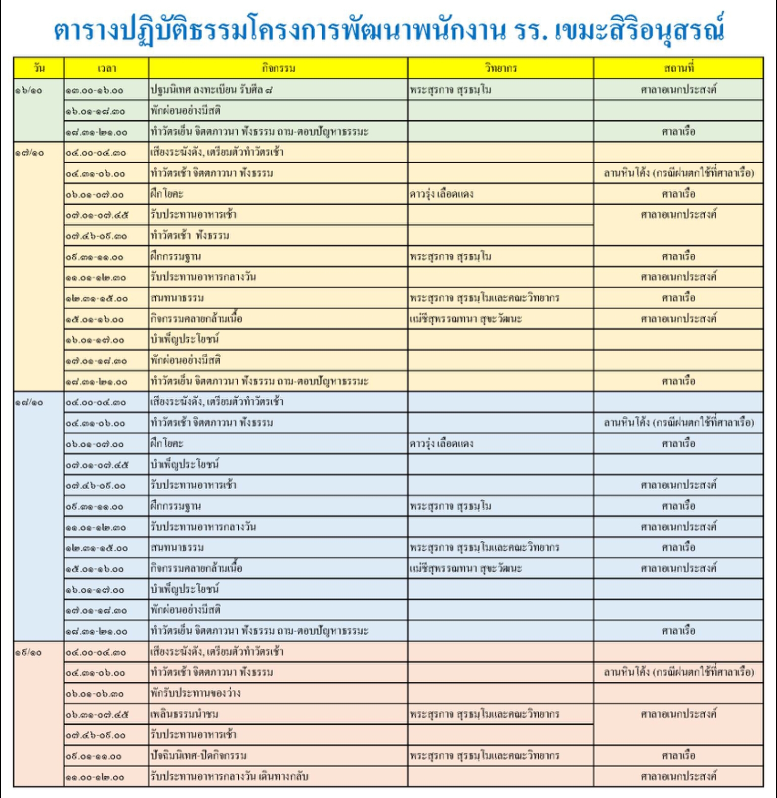 ศุกร์ เสาร์และอาทิตย์ สุดท้ายของเดือน ใช้เวลาว่างให้เกิดประโยชน์สูงสุดกับตนเอง มาพักจิตพัฒนาใจกับเราได้ สถานที่สงบร่มเย็นเอื้อต่อการปฏิบัติให้เจริญก้าวหน้า เป็นการพัฒนาจิตใจให้สุขสงบเย็นเพื่อประโยชน์ตนและเป็นประโยชน์ต่อผู้อื่นต่อไป